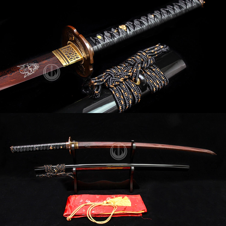 Descrição: Katana feita em aço de alto carbono AISI 1075 dobrado 10 vezes em si mesmo gerando 1024 camadas de aço, especialmente para cortes e impactos. A katana já vem afiada e pronta para aplicação. A lâmina é inteiriça e se prolonga até o fim do cabo para que tenha resistência suficiente para impactos. A katana é feita e afiada manualmente mediante doze processos de afiação. Ela é feita conforme os moldes das katanas tradicionais do Japão feudal e pode ser totalmente desmontada ao se remover os mekuguis do cabo. As peças estão encaixadas de forma precisa e firme, evitando qualquer tipo de balanço das peças durante o manejo. A compra inclui apenas a espada com a bainha. Caso seja desejo do cliente podemos fazê-la sem fio, sem mudanças no preço.